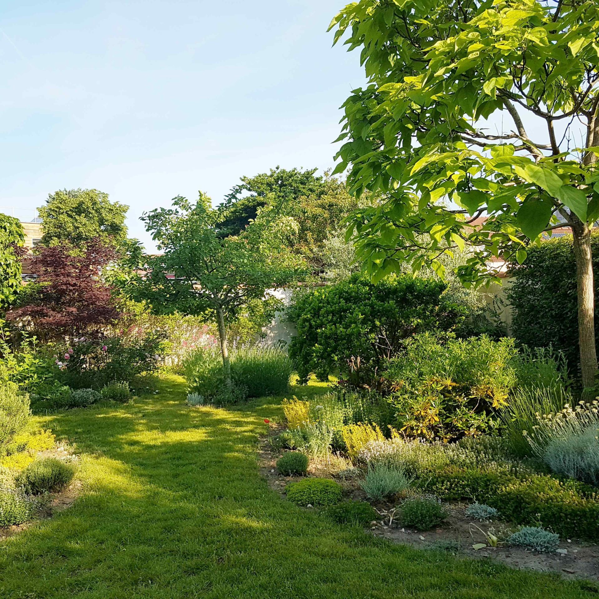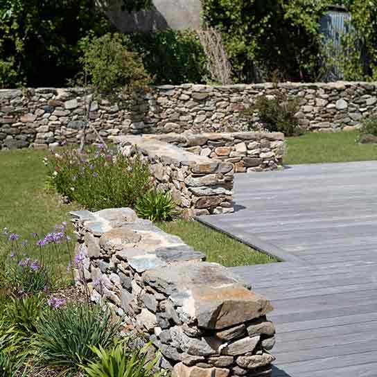 L’enjeu est de créer deux jardins conviviaux aux caractères bien complémentaires, reliés visuellement par une continuité de matières (terrasses en bois, murets, manivelle) et de couleurs.